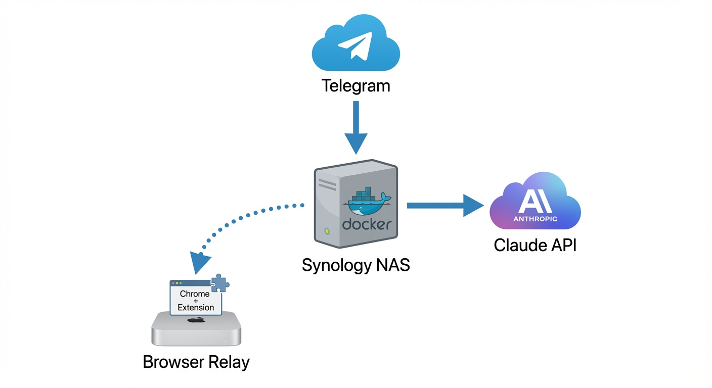Here’s where it gets philosophical. The entire architecture is self-hosted. My gateway runs on my NAS. The browser relay is on my Mac. All traffic stays on my local network (or Tailscale mesh).