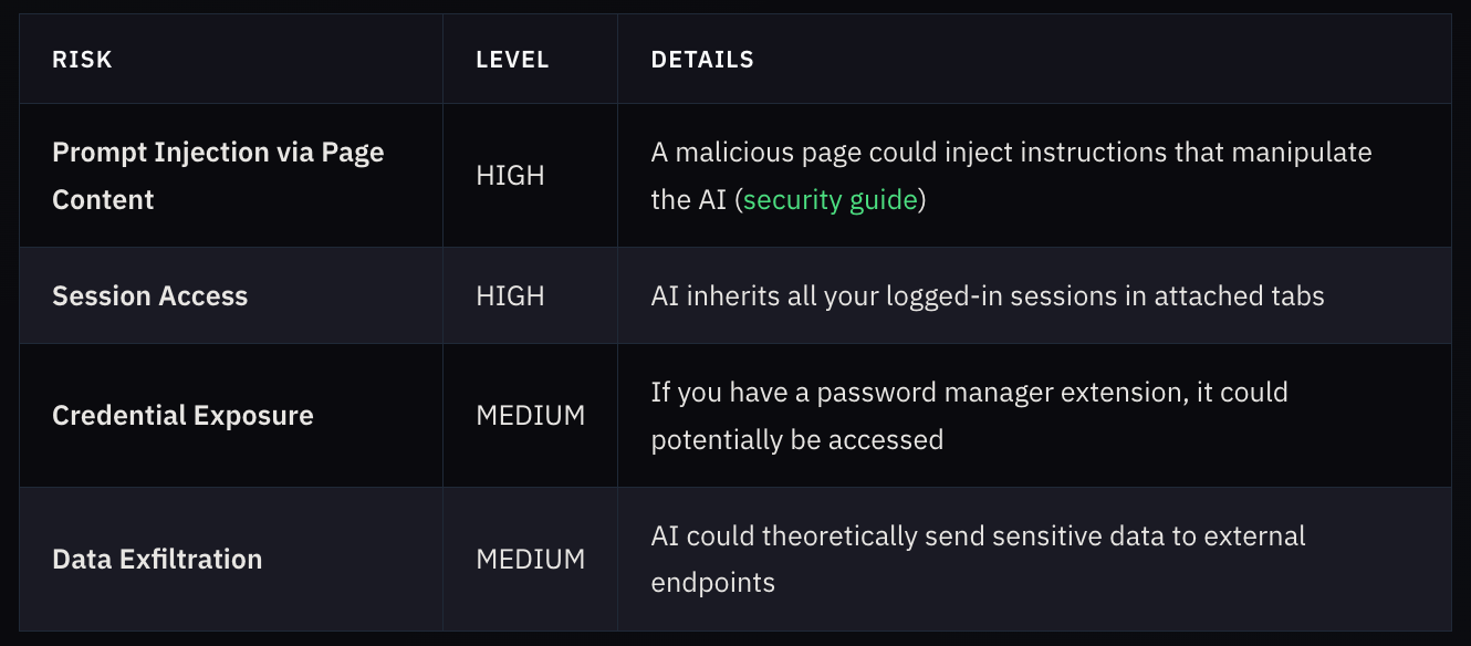 Read that third-to-last point again. If you’re logged into Gmail in that tab, the AI can read and send emails. If you’re logged into your bank… you get the picture.