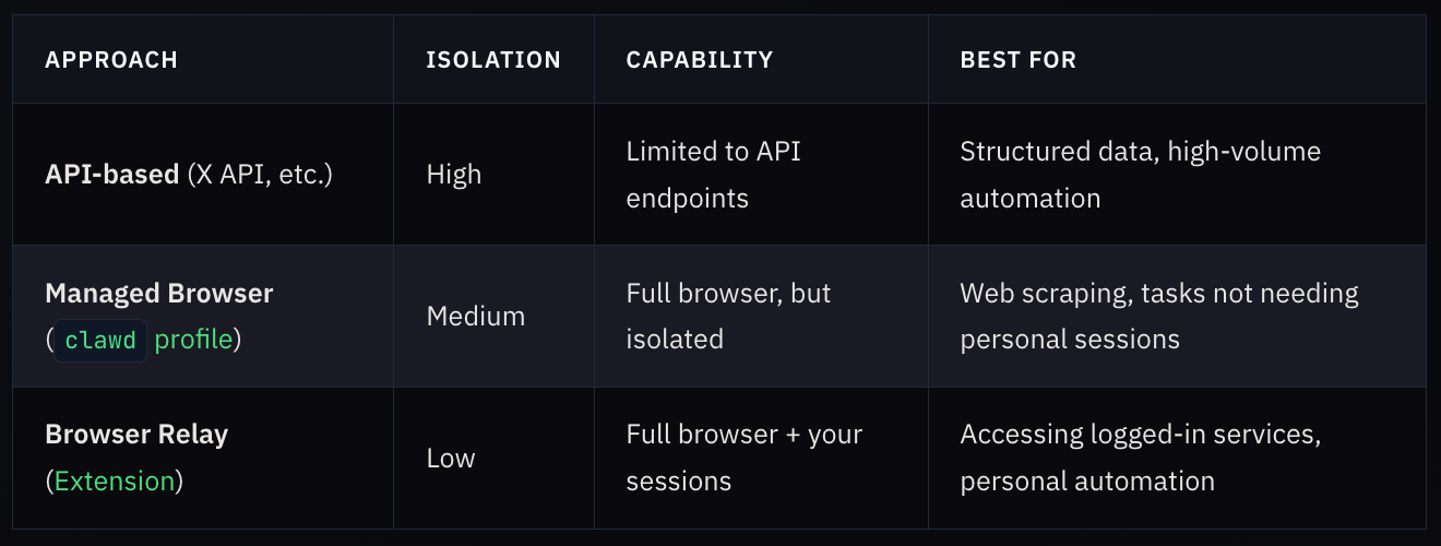 For my bookmark use case, Browser Relay makes sense. I need access to my logged-in X account. An API would require credentials I don’t want to manage. The managed browser would require me to log into X separately.