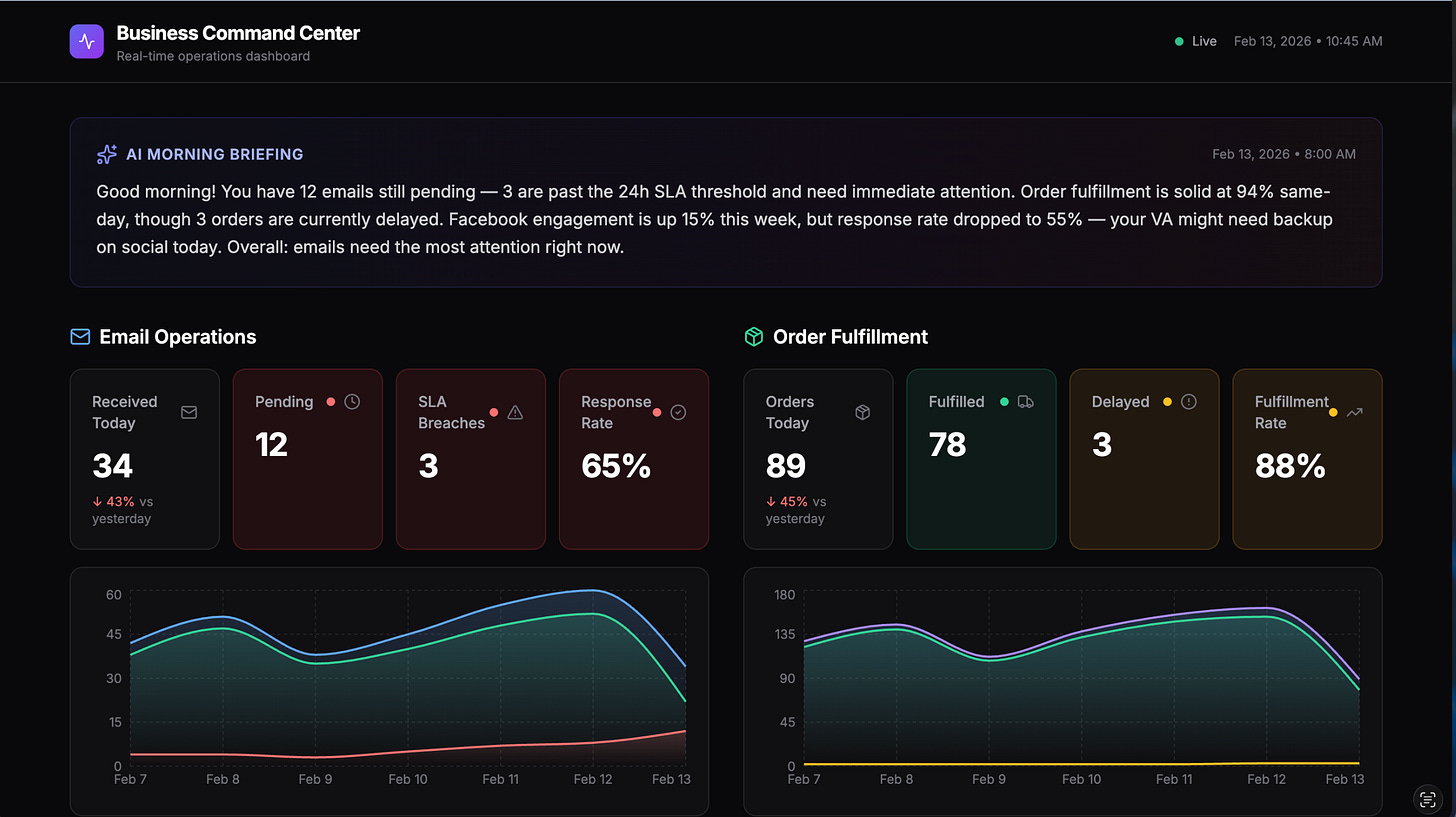 Three panels monitoring email operations, order fulfillment, and Facebook social media responses. Each panel has stat cards with red/yellow/green status indicators, 7-day trend charts, and key metrics. The AI morning briefing at the top summarizes what needs attention in plain English.