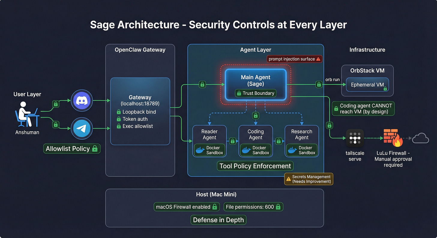 Why? Because the main agent needs to run orb commands, manage crons, send messages, read the filesystem. Sandboxing it would break most of its functionality. The mitigation is limiting what reaches the main agent: no email hooks, no web browsing, no processing untrusted content directly. All external content goes through sandboxed subagents first.