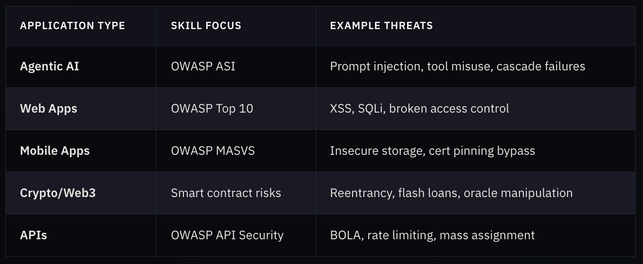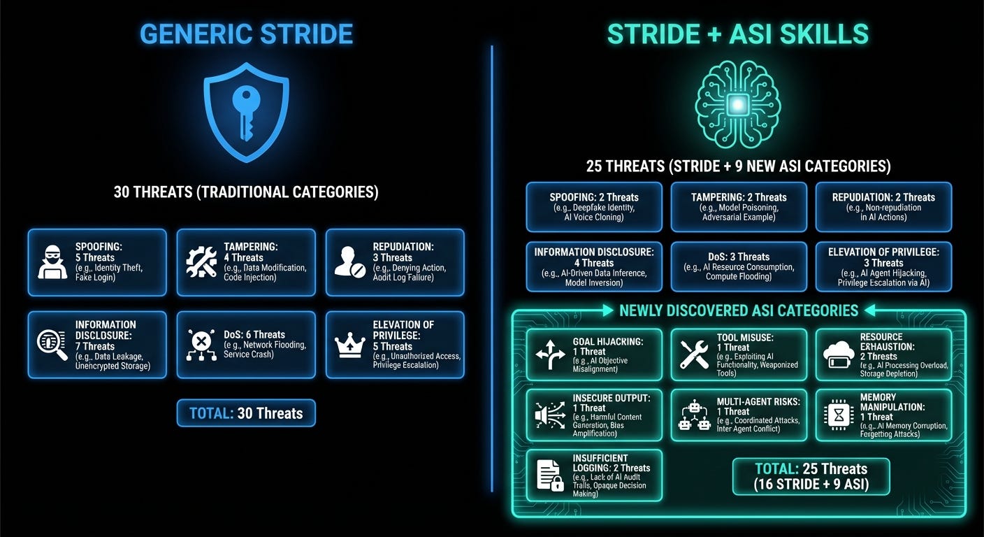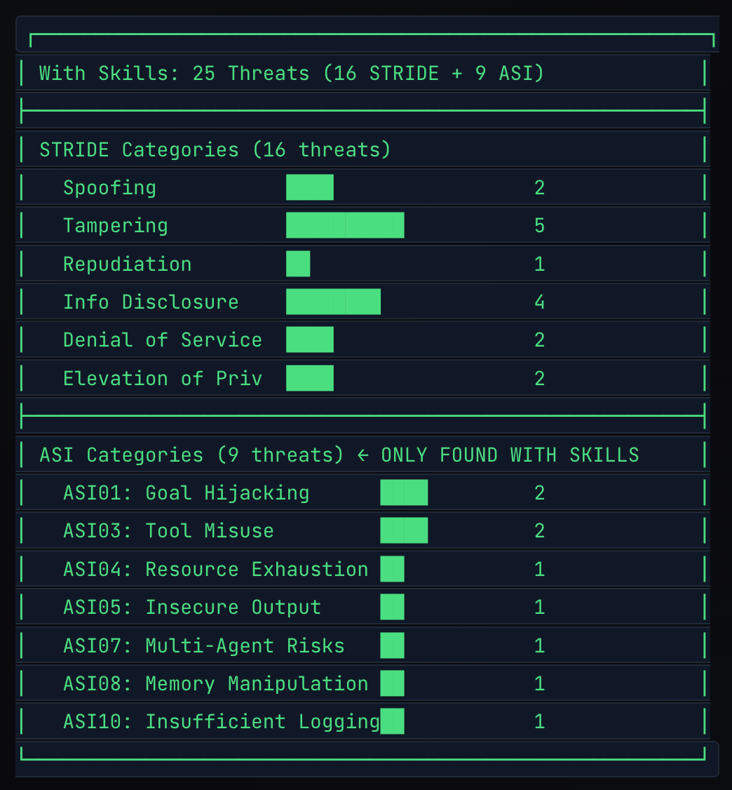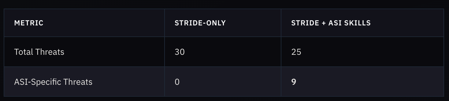 Skills enable context-aware analysis. The skill-augmented run found 9 threats in ASI categories that STRIDE couldn’t categorize—including cascade failures, goal hijacking, and context pollution.