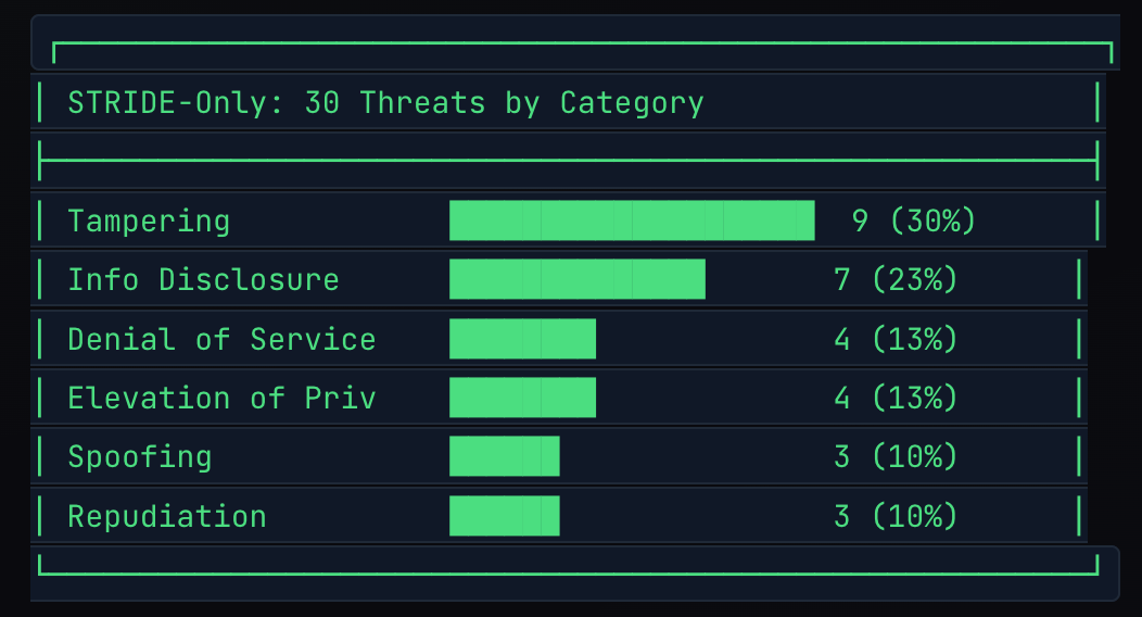 The skill-augmented run found 9 threats in agentic-specific categories that generic STRIDE simply cannot identify. These aren’t relabeled STRIDE threats - they’re fundamentally different risk categories that only exist in multi-agent systems.