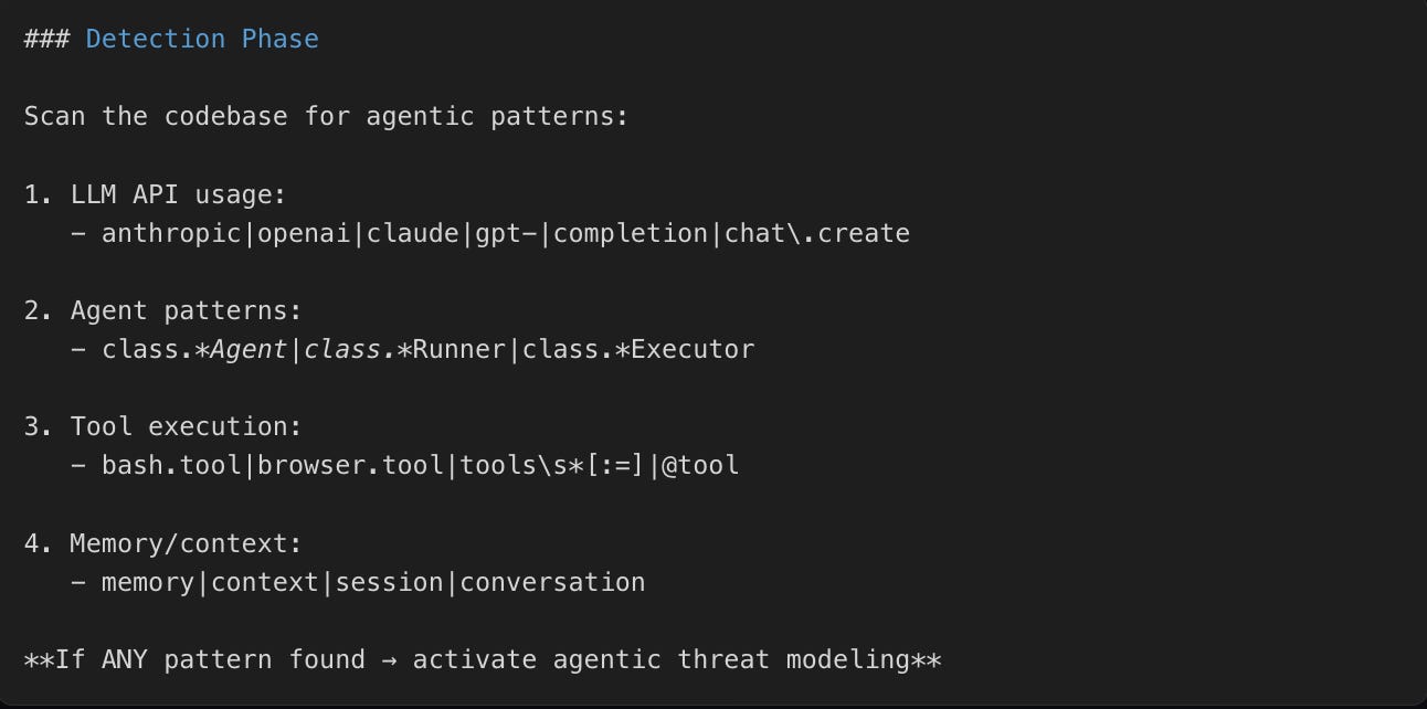 This is what enables targeted analysis. The agent knew it was analyzing a multi-agent system before it started threat modeling, so it applied the right mental models.