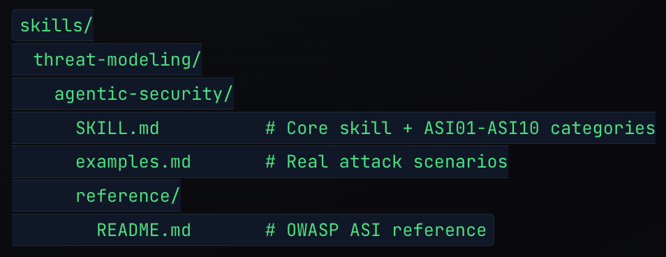Add the skill to your .claude/ directory or reference it in your CLAUDE.md. The next time you ask Claude Code to threat model an agentic application, it will have the full OWASP ASI taxonomy with detection patterns and examples.