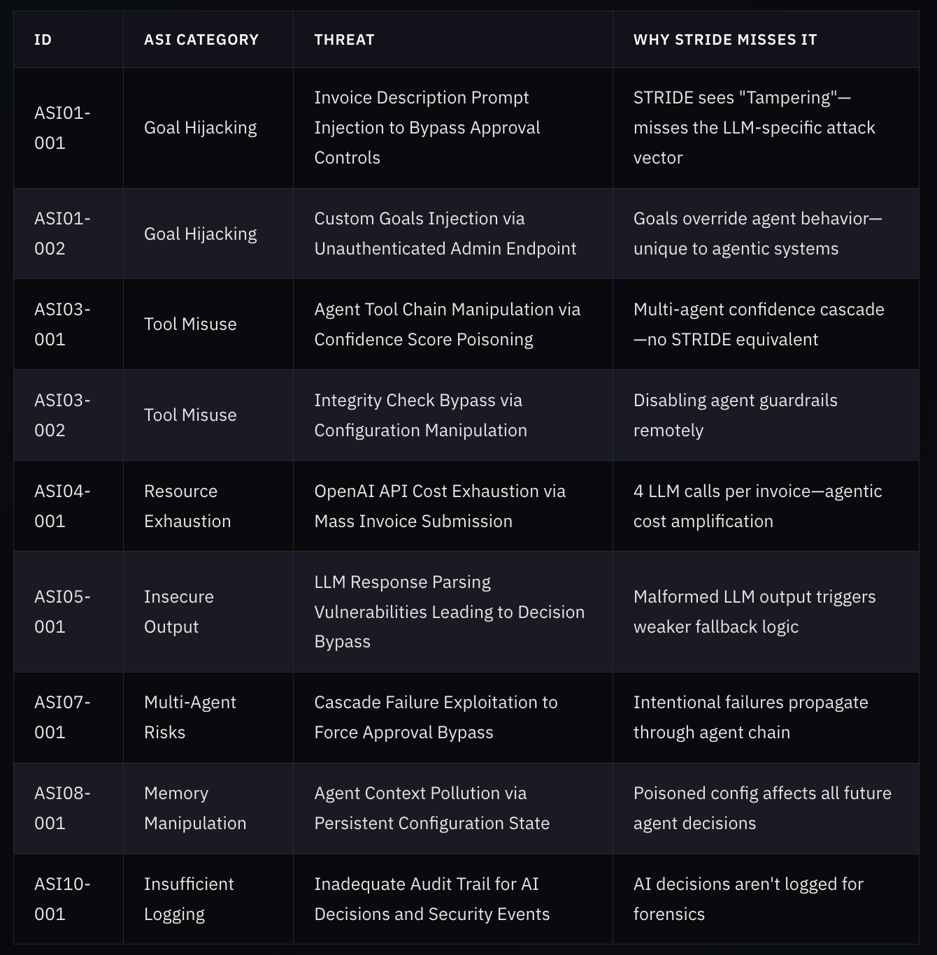 ASI07 (Cascade Failure Exploitation) is a perfect example: an attacker can trigger specific failures in one agent that manipulate downstream agents through confidence propagation. This is a risk unique to multi-agent systems - STRIDE has no category for it.